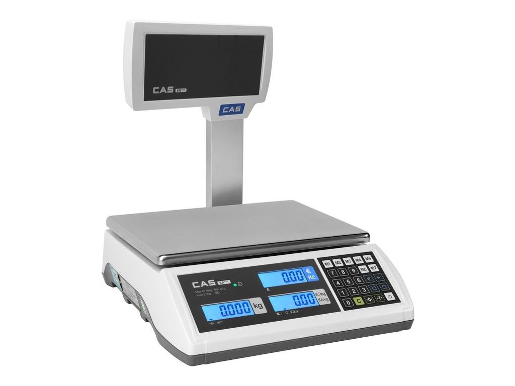 Funkce: - tárování, 7 předvoleb pro přímé ceny - automatické vypínání váhy - po 10, 30, 60 minut („Auto Power OFF“) - programování přednastavených položek – PLU kódů - lze přednastavit až 199 předvolených položek PLU (s čísly od 1 do 199), z toho PLU kódy č.1 až 7 jsou přímo na klávesnici na jeden stisk tlačítka. Do paměti se ukládá jednotková cena. - možnost nastavení směnného kursu Kč/ € - standardní komunikace RS-232 jako u ostatních modelů CAS - možnost připojení k pokladně Euro, QMP nebo PC.